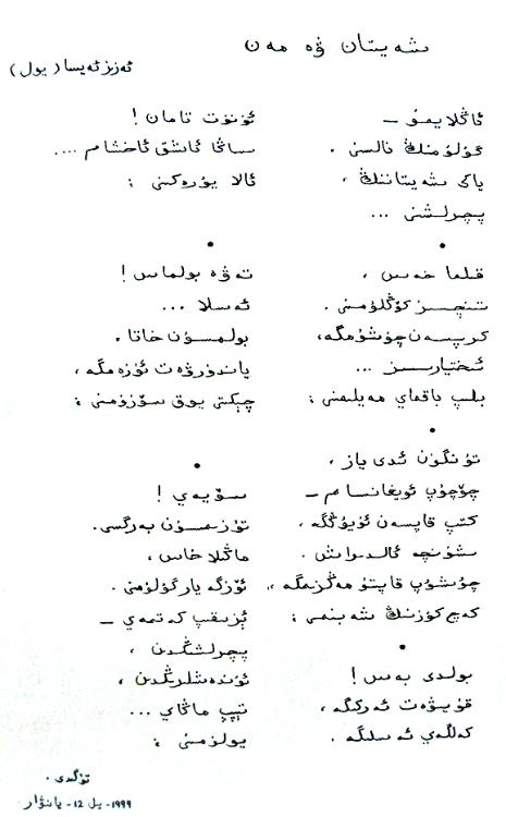 Méning eqlimge singip kirgen "sheytan" sözi peqetla adettiki istémalda qollinilidighan "sawabliq" yaki "gunah" qilmishliri otturisidiki talash-tartishlardin yiraqtiki bir "sheytan" dur. Téximu éniq qilip éytsam u belkim men töwendiki shé’irimda teswirligen méning dostane "sheytinim" dur... Sheytan muhebbet we söygüge tolghan yashliqning sarangliq dorisi bolsa ottura yashliqlarning ézitqu dorisi, yashan’ghanlarning bolsa pushayman dorisidur. Bu shé’irni men Eziz Eysa (Aziz Isa) 1999- yili yanwar Aqsuda yazghan. Keng tordashlarning yaqturup oqushini arzu qilimen.